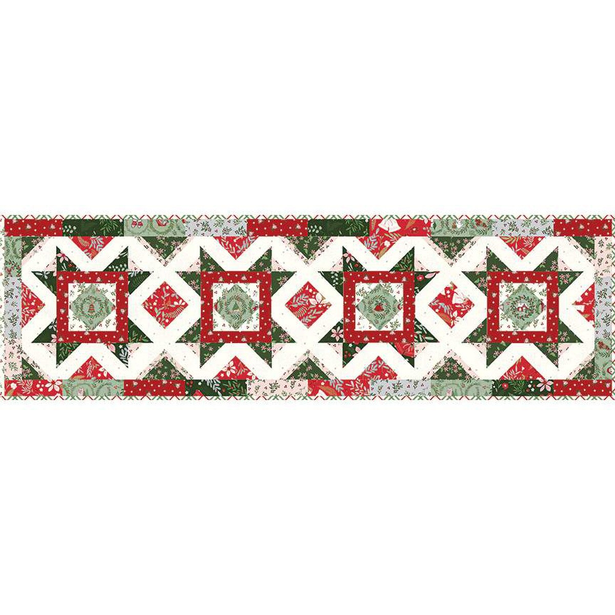 A Little Christmas Runner Kit includes pattern and fabric for runner top and binding. Backing not included. Fabric featured is Mistletoe & Holly by Beverly McCullough of Flamingo Toes. Pattern is also by Bev. Finished size is 18″ x 60″. Kit comes in a solid box with a printed belly band label. Box size is approximately 6″ x 10″ x 2 1/2″.