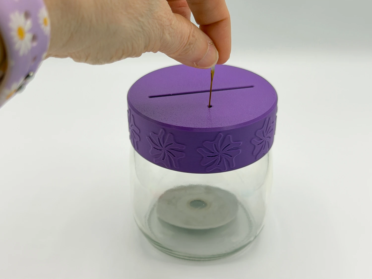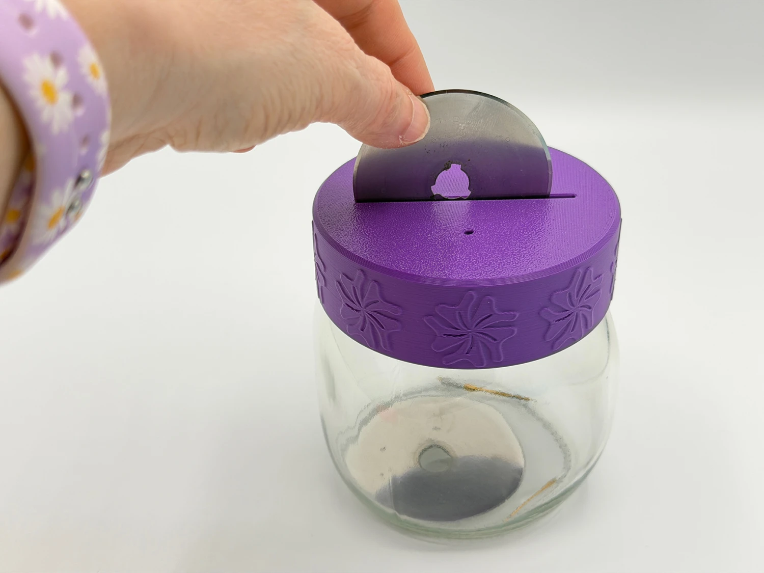 Use the Blade CAPture to store your used rotary blades of all sizes and sewing needles. The Blade CAPture was designed to fit all wide mouth canning jars (Ball and Kerr are the most popular but they were tested with generic canning jars as well). There is a tapered slot for blades and a tapered hole for needles. This makes it easy to drop in the used sharp, but they do not come back out.