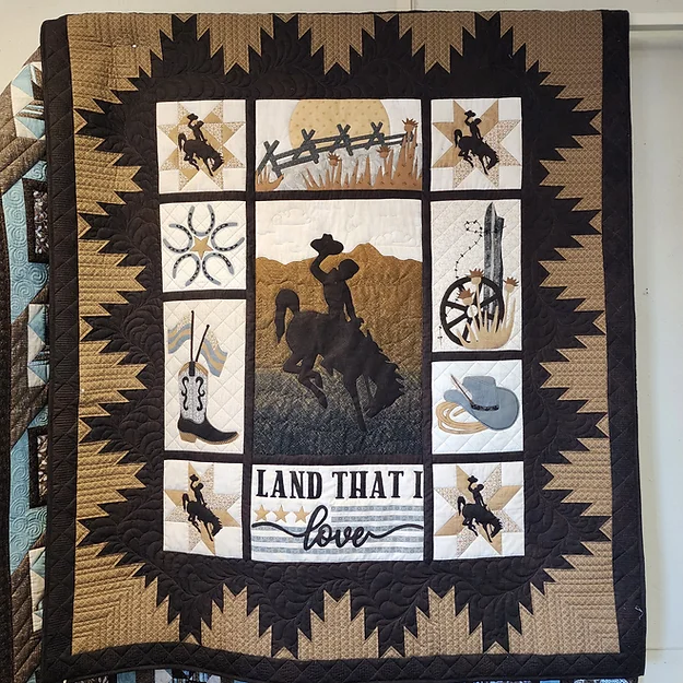 Cowboy Up applique quilt pattern designed by Bobbi Clark and Roni Hickey features all things cowboy and western. The photos are showing this quilt made up in two different color schemes. The pattern is designed for raw edge fusible applique. The pattern contains instructions, full size layout guides, pattern pieces that are already reversed for applique and block piecing layout. Finished Quilt Size 60″ x 70″ Full