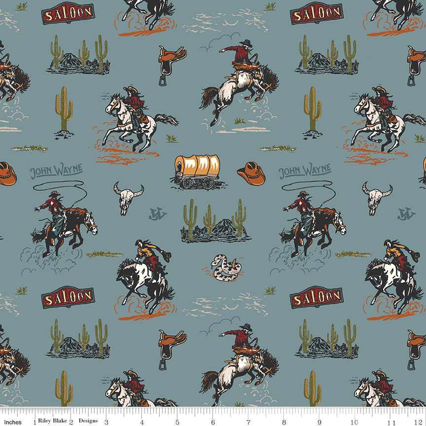 The John Wayne Courage collection for Riley Blake Designs is great for quilting, apparel and home decor. This print features cowboys and horses, cactus, rattlesnakes, saddles, the John Wayne logo, and more. Official licensed product.