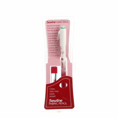 The Sewline Mechanical Fabric Pencil’s specially formulated ceramic lead gives a clean fine line on fabrics. Lines are easily removed from most fabrics with the attached eraser, by dabbing with a damp cloth or washing. Includes one container of six ceramic lead refills. 0.9pt leads. Easy to refill with up to 6 leads.