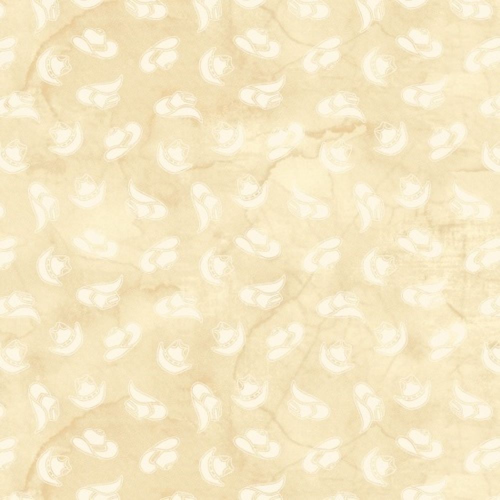 This is a gorgeous western fabric, brought to you by Blank Quilting! The background is a nice rustic ivory color, and there are lighter ivory cowboy hats all over the fabric! This would make a great background fabric for any western quilt.